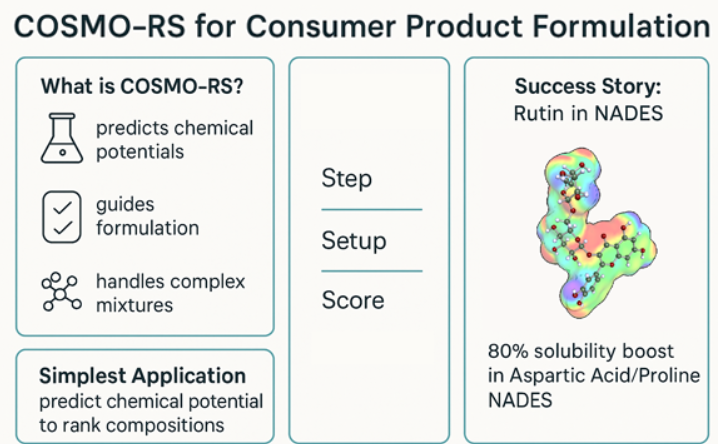 Sin embargo, el experto en formulación de productos de consumo puede descartar inicialmente COSMO-RS como una herramienta útil debido a la complejidad de las mezclas reales. Después de todo, los productos de consumo (como champús, cosméticos o detergentes) a menudo contienen dispersiones altamente estructuradas, así como sustancias complejas que participan en interacciones intrincadas…