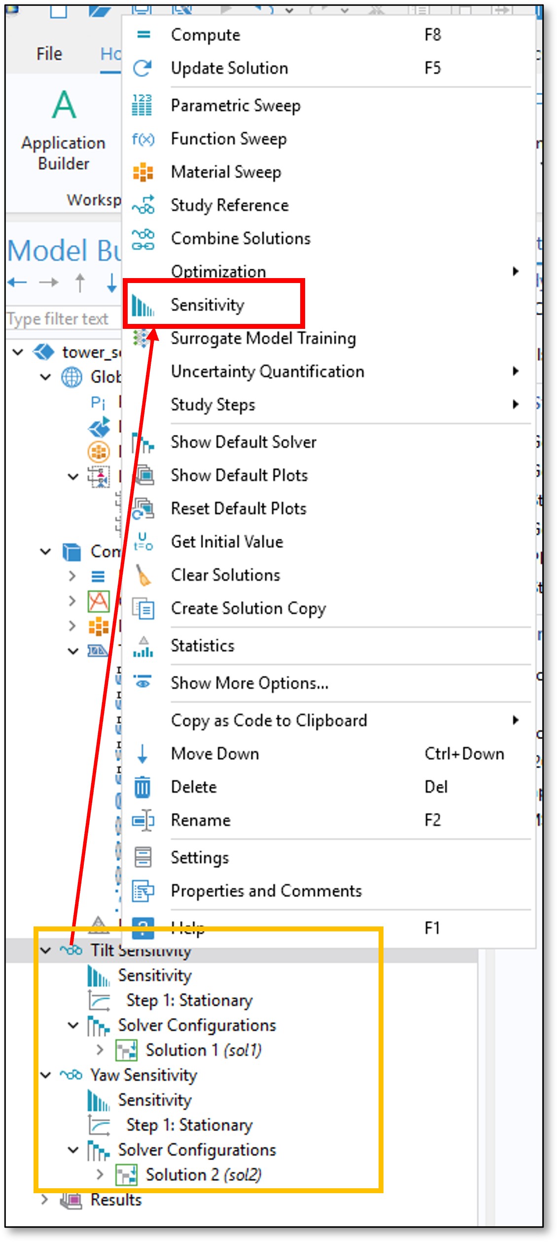 En un primer análisis de sensibilidad etiquetado como “Tilt sensitivity” se analiza el efecto que tienen las cargas que se aplican en la inclinación de la torre; en el segundo análisis de sensibilidad etiquetado como “Yaw sensitivity” se estudia el efecto de esas cargas en la torsión de la torre. En ambos casos, para las vigas verticales como las transversales e inclinadas. En la Figura 3 se destacan estos dos análisis de sensibilidad incluidos como nodos del Model Builder.