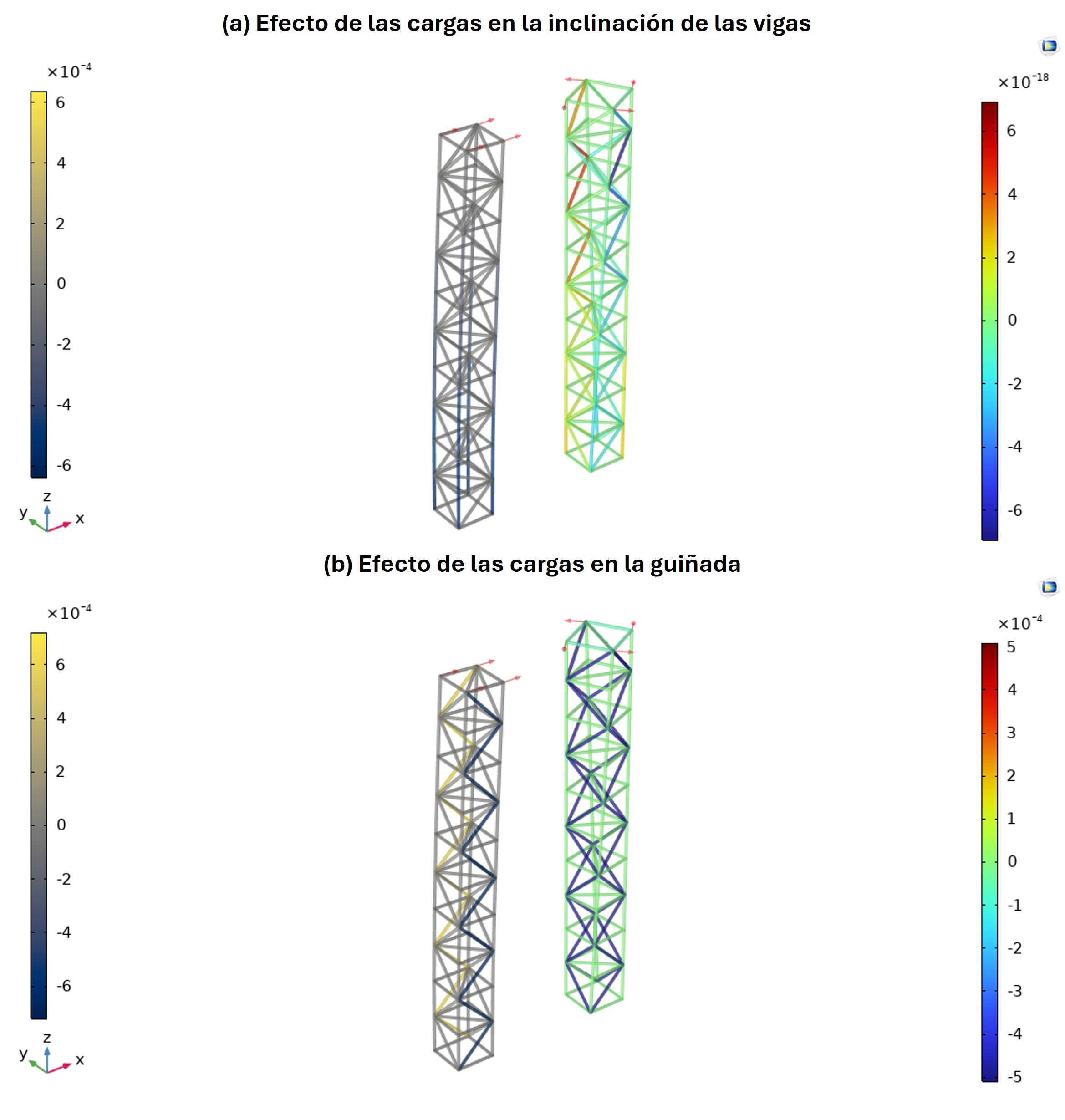 En cuanto a los resultados obtenidos, la Figura 4 (a) muestra cómo varía en la inclinación de las vigas debido a las cargas que actúan en la parte superior de la torre de celosía, y en la Figura 4 (b) se muestra la variación en la guiñada.