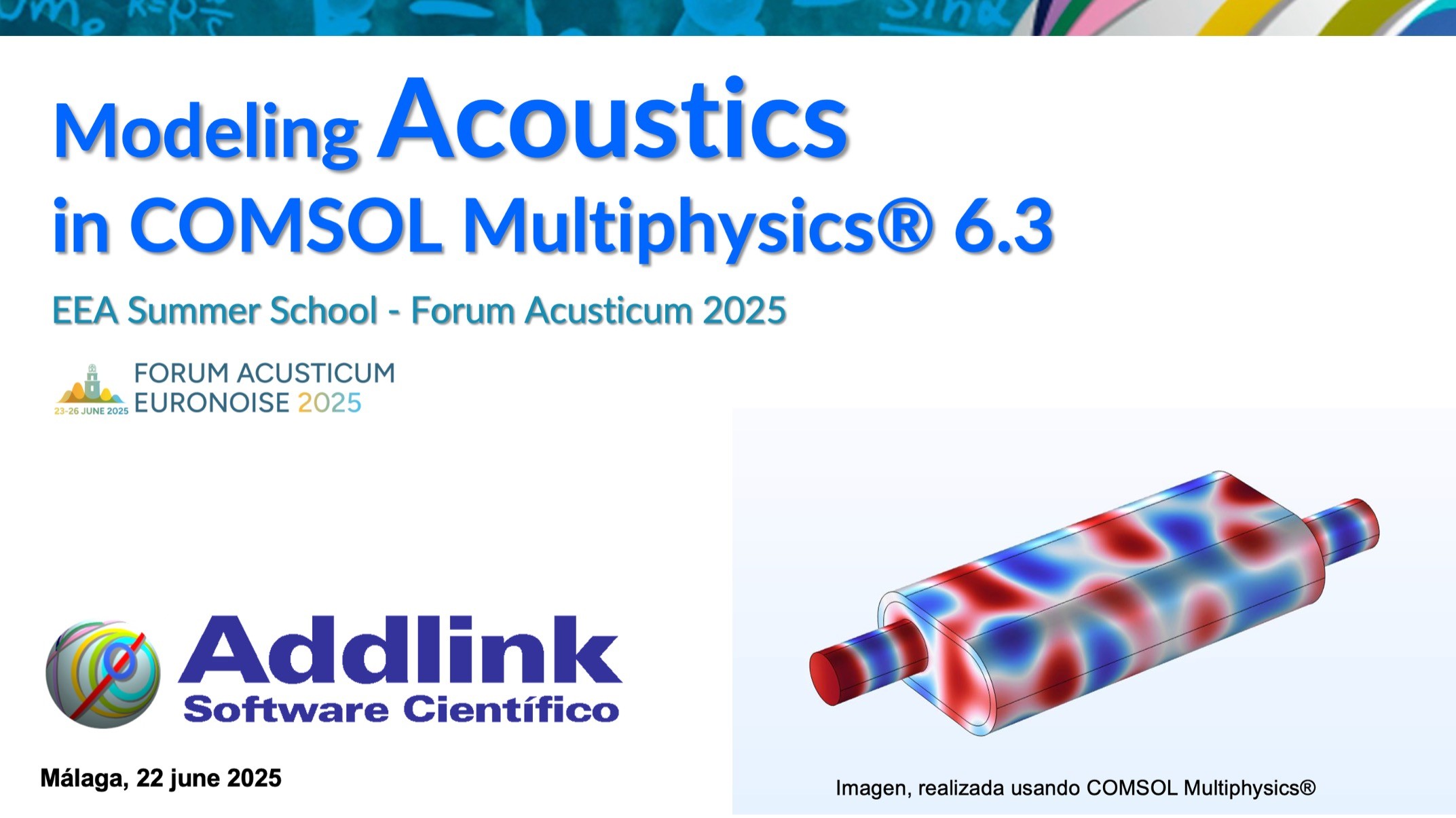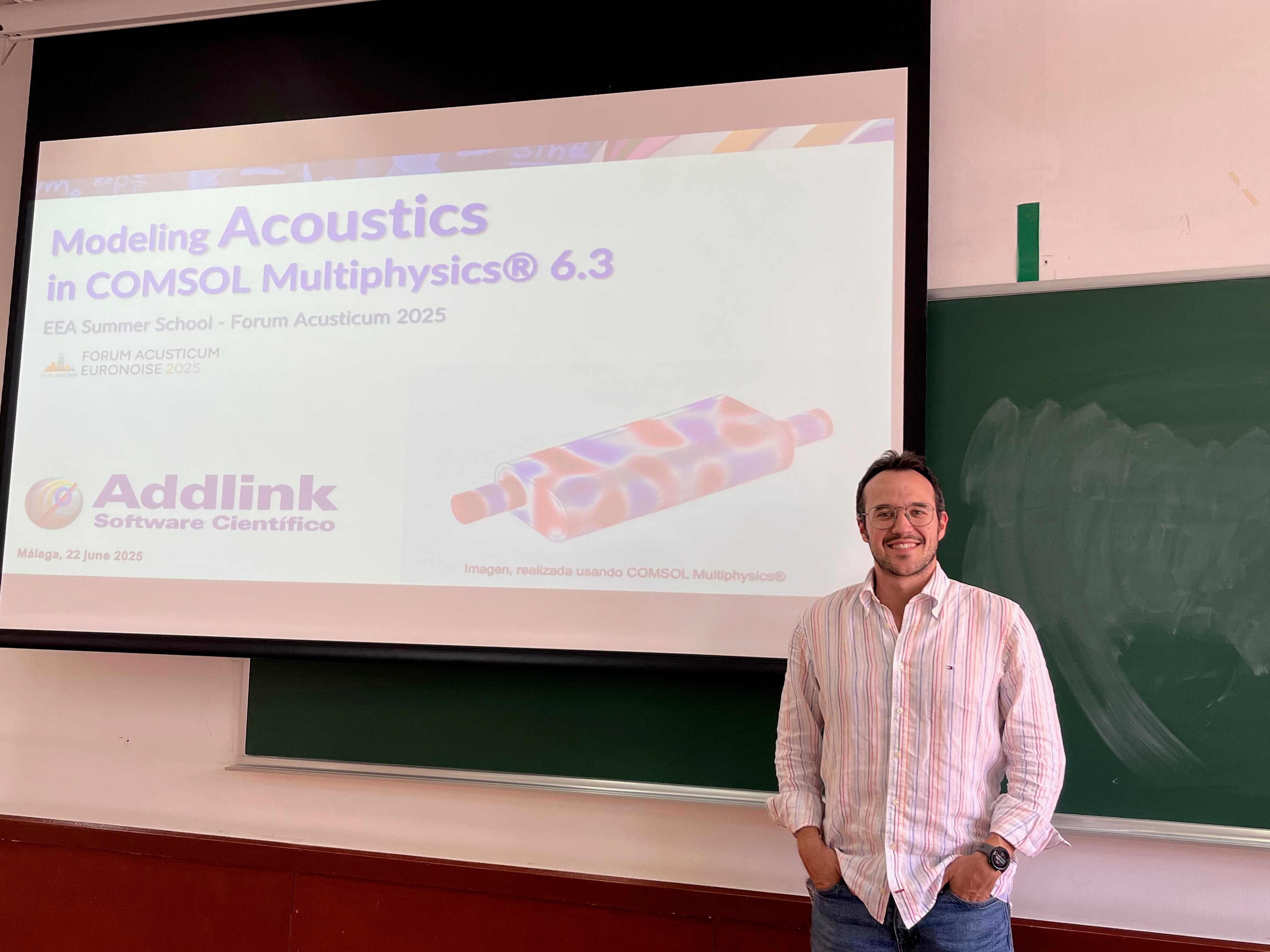 Durante la sesión formativa, Addlink contribuyó con una presentación técnica dedicada a COMSOL Multiphysics®, destacando su potencial como plataforma avanzada de modelización y simulación de fenómenos acústicos y vibracionales. Se mostraron casos prácticos donde se ilustraron tanto problemas clásicos de propagación del sonido como configuraciones más complejas que implican la interacción entre múltiples físicas, como la acústica estructural, la aeroacústica o la transferencia de calor acoplada al sonido.
