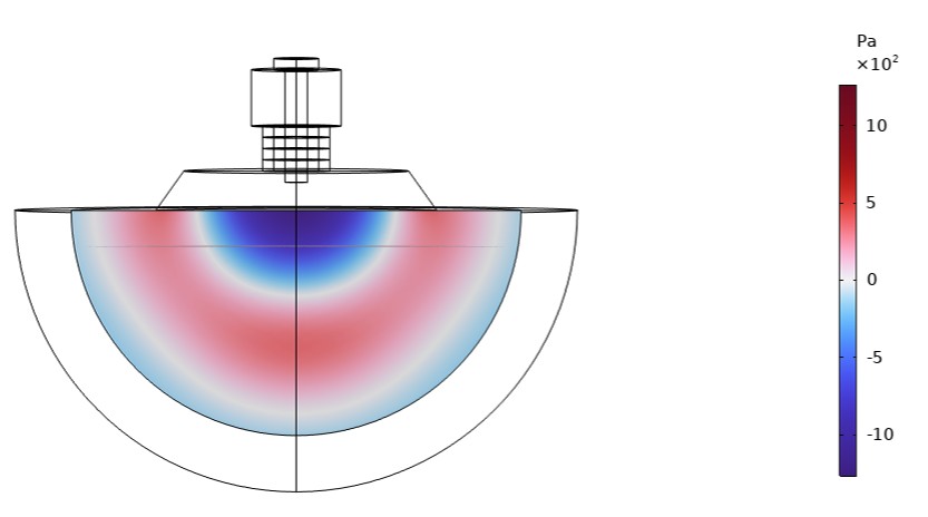 En definitiva, COMSOL Multiphysics® es la elección ideal cuando el proyecto exige profundidad física, flexibilidad y la posibilidad de explorar soluciones avanzadas más allá del diseño convencional. La Figura 1 muestra como ejemplo la malla creada para un altavoz modelizado en COMSOL Multiphysics®. La Figura 2 muestra la presión acústica total en un plano 2D de un ejemplo de transductor piezoeléctrico calculado en COMSOL [2].
