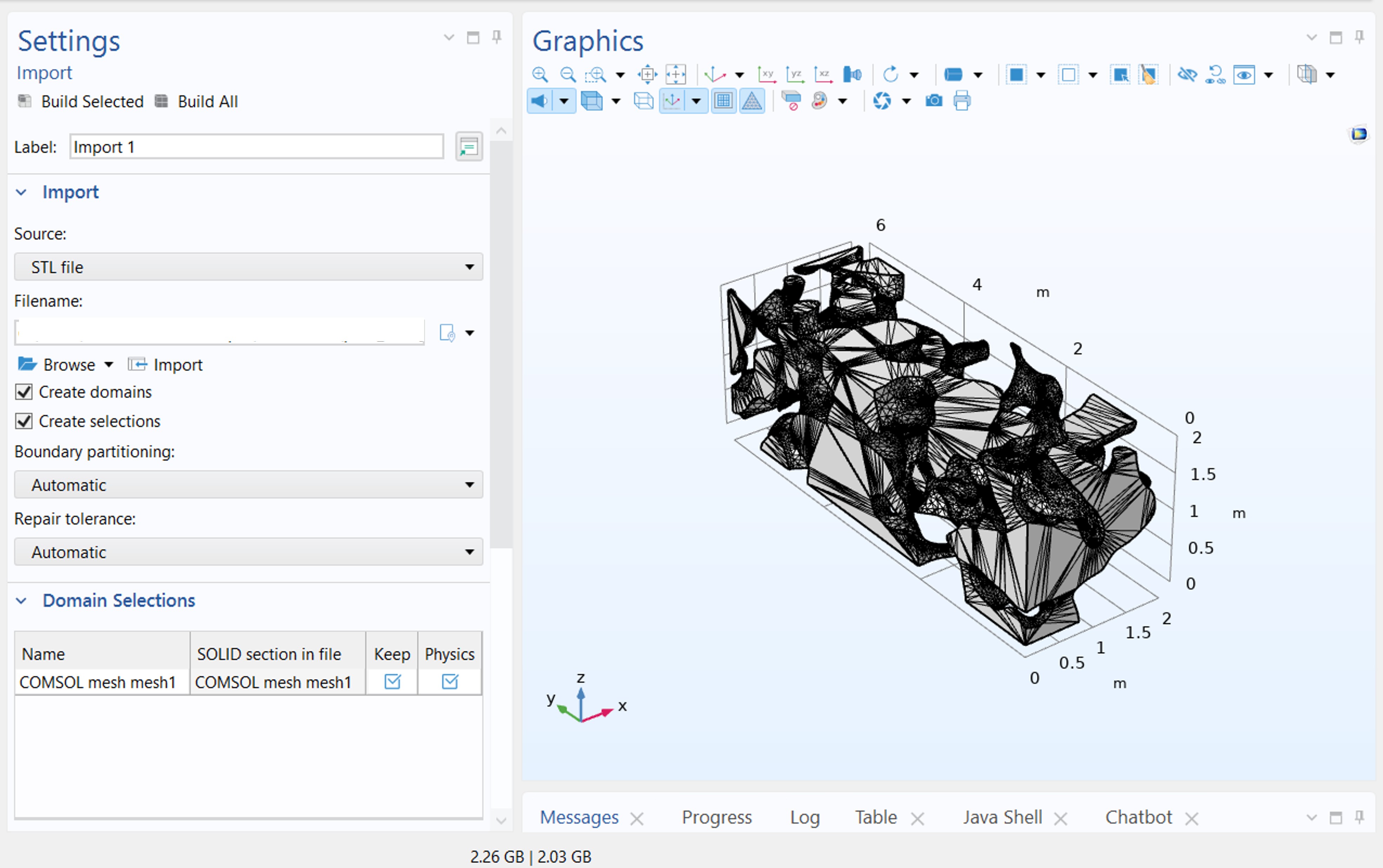 Figura 2. Geometría creada en COMSOL Multiphysics 6.4 a partir de un fichero con información del mallado, utilizando la nueva funcionalidad “Add Mesh-Based Geometry”.
