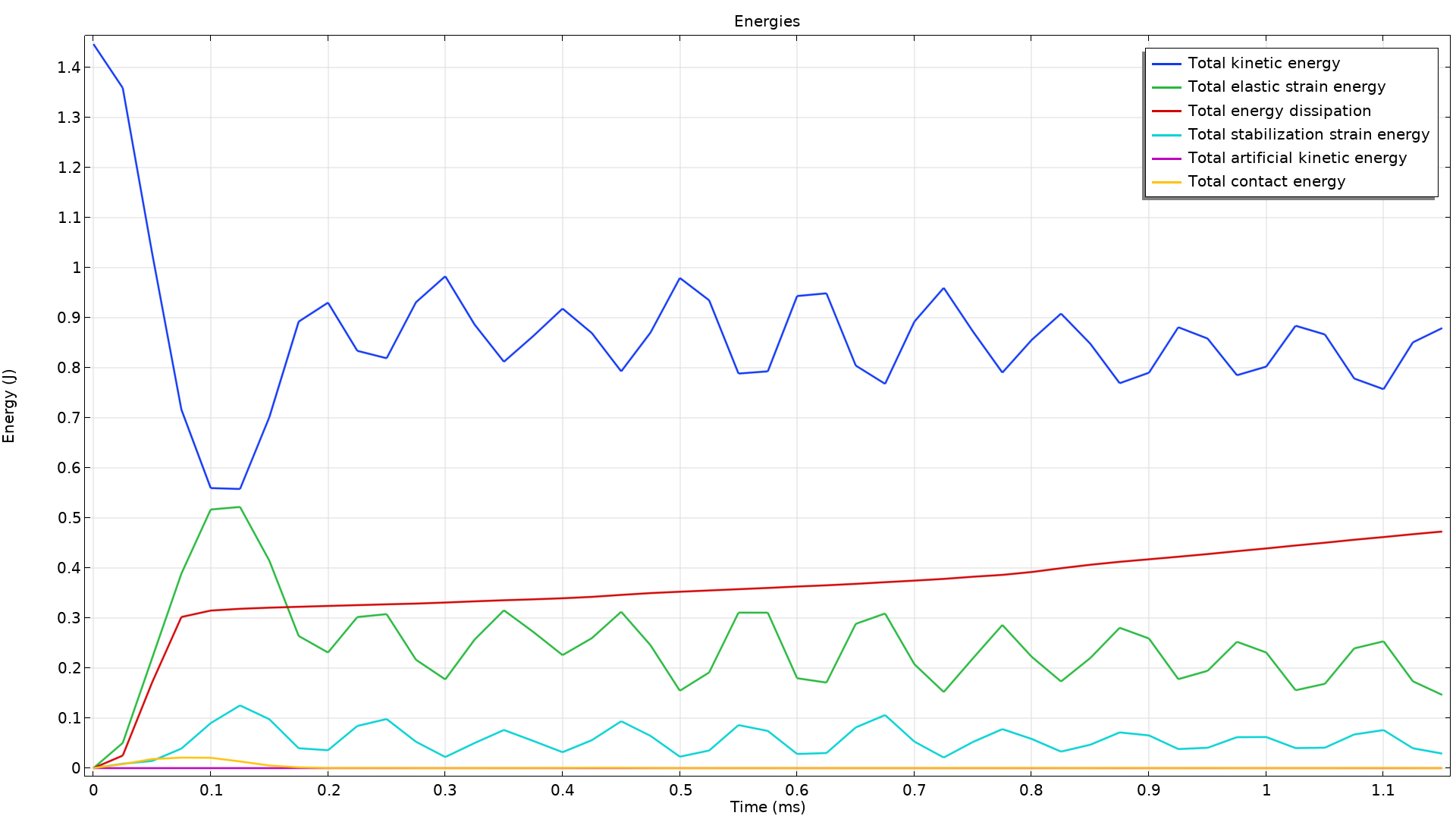Lo más relevante para el usuario de COMSOL Multiphysics® es el Balance Energético. La herramienta permite monitorizar cómo la energía cinética se transforma en energía de deformación elástica y cuánta se disipa a través del daño plástico y la rotura (Figura 2). Esto permite identificar los puntos críticos del diseño para reforzar el chasis y proteger la electrónica interna.