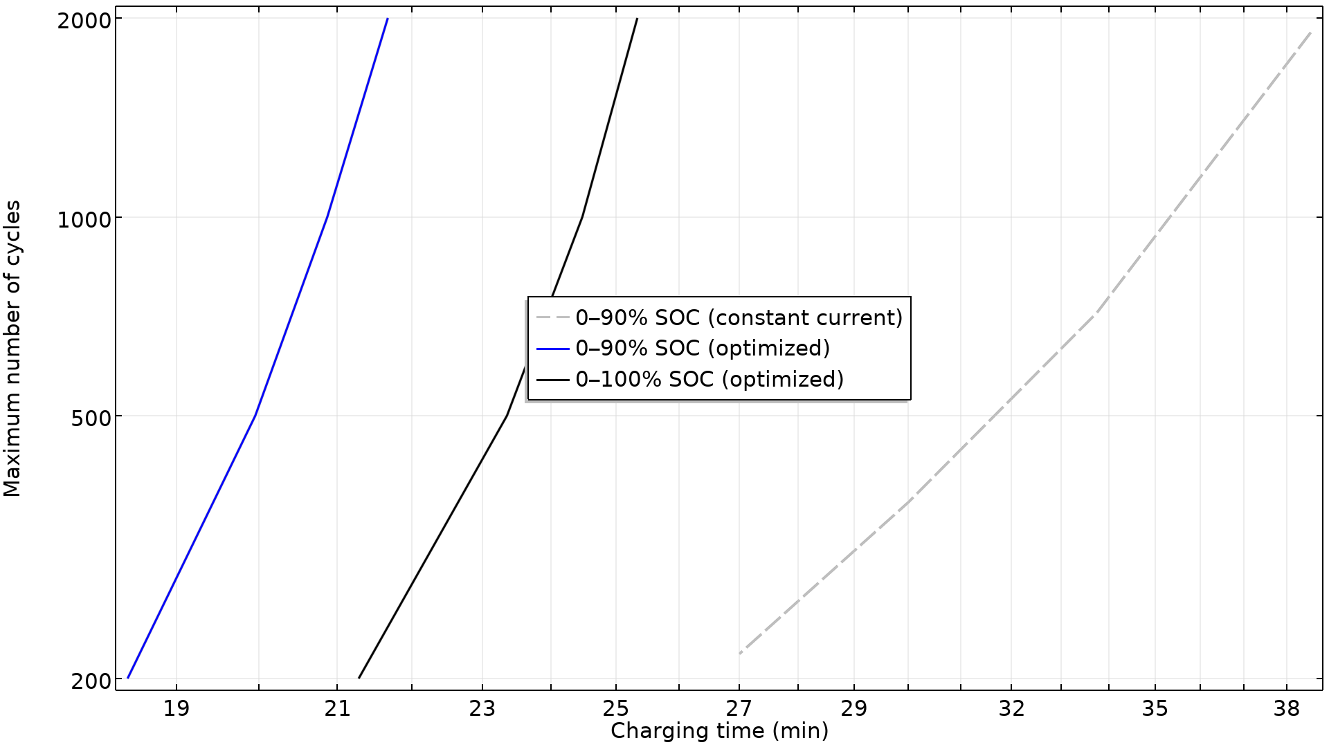 La simulación permite encontrar el Frente de Pareto: un gráfico que muestra el equilibrio perfecto entre "tiempo de carga" y "ciclos de vida permitidos". La Figura 1 muestra el número máximo de ciclos frente al tiempo de carga para alcanzar un estado de carga (SOC) del 90% y del 100%. También se incluye el resultado de una corriente de carga constante (línea discontinua) para ilustrar mejor el beneficio de utilizar una corriente variable en el tiempo.