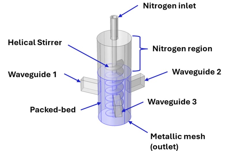 En un artículo recientemente publicado en Scientific Reports [1], el autor utilizó COMSOL Multiphysics® como plataforma central para desarrollar un modelo multifísico de un reactor de lecho fijo calentado por microondas, como se muestra en la Figura 1. En su núcleo, el diseño consiste en un eje rotatorio acoplado a un agitador personalizado, alojado dentro de un depósito metálico que actúa como cavidad resonante de microondas (MW). El agitador está fabricado con componentes metálicos capaces de soportar las tensiones mecánicas impuestas por el lecho denso y abrasivo de esferas de carburo de silicio (SiC).