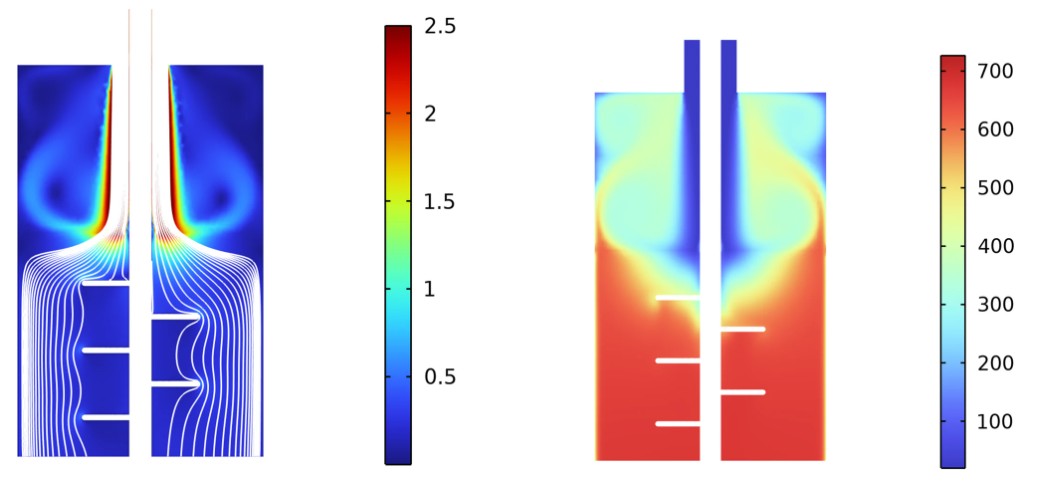 En cuanto a alguno de los resultados obtenidos, la Figure 2 muestra una Vista en plano de corte de la velocidad (izquierda, m/s) y de la temperatura del fluido (derecha, °C).