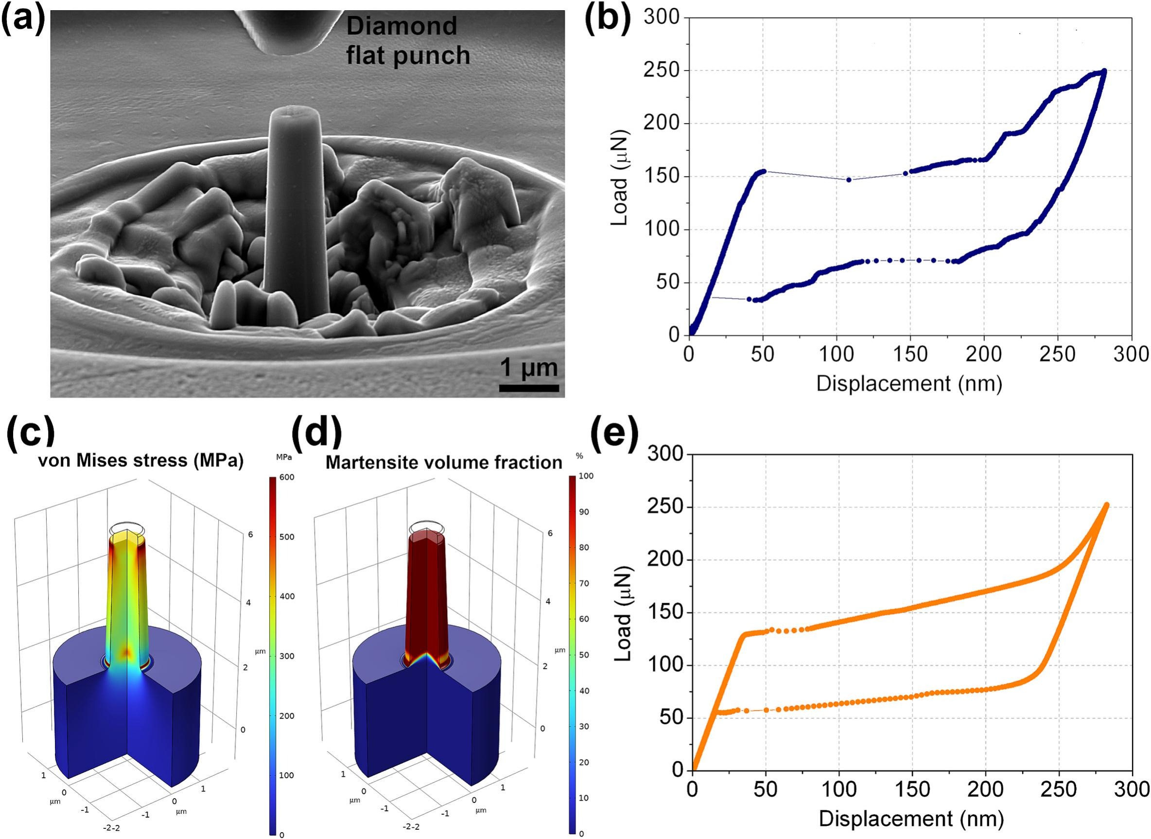 Figura 1. Ensayos de nanocompresión in situ y simulación. (a) Micrografía del montaje de nanocompresión in situ para un nanopilar individual de Cu–Al–Ni (∼900 nm de diámetro en la parte superior y 4 µm de altura) cargado con un punzón de diamante plano-cónico de 1 µm de diámetro en la punta. (b) Curva experimental carga–desplazamiento superelástica obtenida bajo un ciclo triangular de carga–descarg. (c, d) Modelo de elementos finitos en COMSOL Multiphysics® del nanopilar durante la nanocompresión, mostrando las distribuciones de la tensión de von Mises (c) y la fracción de volumen de martensita (d). (e) Respuesta superelástica carga–desplazamiento simulada utilizando el modelo constitutivo de Souza–Auricchio.
