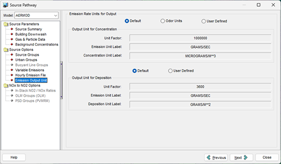 El modelo AERMOD incluye unidades predeterminadas para las entradas de emisiones y las salidas de concentración o deposición. Las emisiones se expresan en gramos por segundo (g/s) y las concentraciones se calculan en microgramos por metro cúbico (µg/m³) . Sin embargo, puede que sea necesario modificar estas unidades predeterminadas para representar mejor los datos del proyecto. Este cambio se puede realizar fácilmente mediante las opciones Source Pathway.