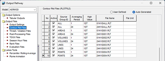 Un ejemplo es la salida PLOTFILE generada por el modelo de dispersión de aire AERMOD. En AERMOD View de Lakes Environmental, los usuarios habilitan este tipo de salida mediante la configuración de Contour Plot Files en la ruta de salida Output Pathway. Estos archivos reportan valores máximos definidos por el usuario (de 1 a 999) en cada receptor modelado. Para períodos de promedio a corto plazo (p. ej., 1 hora, 24 horas, etc.), estos valores máximos son independientes del tiempo, lo que significa que cada valor reportado puede ocurrir en momentos diferentes.