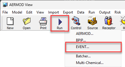 El siguiente paso es ejecutar AERMOD de nuevo utilizando el archivo de entrada de procesado EVENT. Esto inicializará la ejecución del modelo EVENT para calcular las contribuciones de la fuente. En AERMOD View, esto se realiza mediante el menú Run.