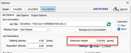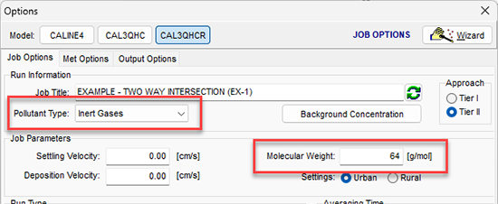 - Las opciones para cambiar se encuentran en la pestaña Job Options de la ventana Options. Primero, cambie el tipo de contaminante (Pollutant Type) a Inert Gases.