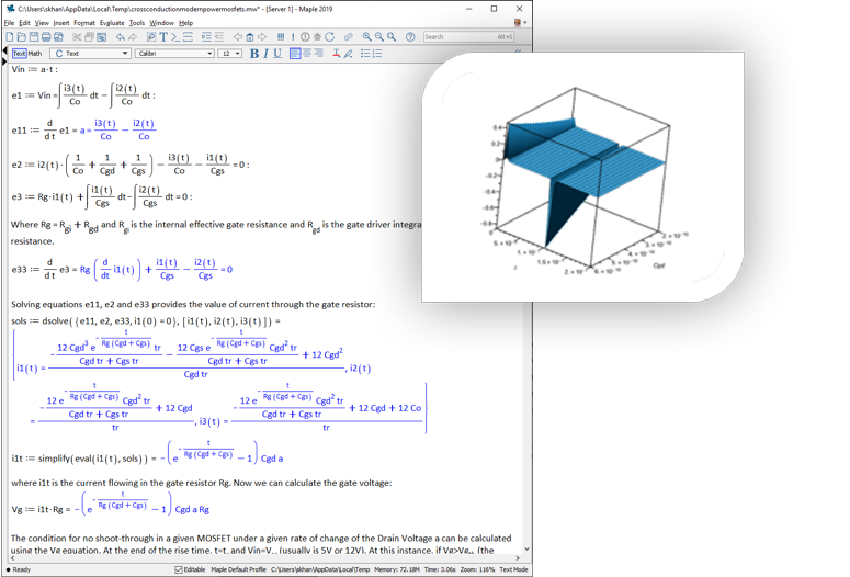 Los semiconductores son dispositivos complejos, pero Maple le ayuda a derivar los modelos matemáticos para describir con precisión sus características. Los MOSFET son un componente esencial de la electrónica moderna, como los teléfonos inteligentes y otros dispositivos portátiles. Los MOSFET de baja potencia son cruciales para la conmutación en sistemas de alimentación. Con Maple, puede convertir modelos de circuitos equivalentes de MOSFET en ecuaciones analíticas escribiendo y manipulando las relaciones básicas. Estas aplicaciones, por ejemplo, le ayudarán a modelar el efecto de la inductancia de la fuente y la conducción cruzada en los MOSFET de potencia modernos. |