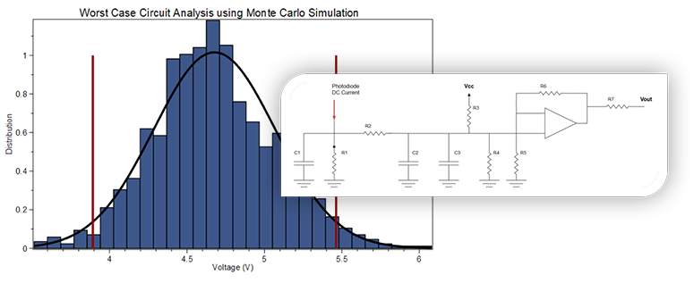 Los componentes eléctricos se fabrican en grandes cantidades. Las inconsistencias en los materiales y el proceso de fabricación hacen que los parámetros de los componentes tengan una distribución estadística. Es decir, la resistencia de un lote de resistencias podría describirse mediante una distribución normal. Dada la cantidad de componentes de un circuito y la distribución de sus parámetros, es posible que el circuito no funcione según lo especificado. Este riesgo debe identificarse, gestionarse y mitigarse en las primeras etapas del proceso de diseño. Los ingenieros eléctricos suelen usar Maple para el análisis de circuitos en el peor de los casos. Se puede emplear: