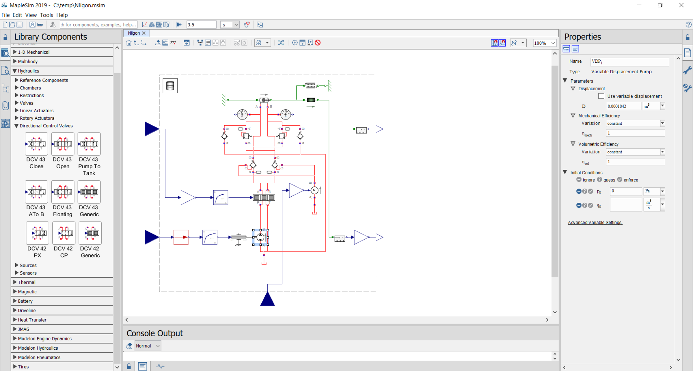 Para crear el modelo de simulación, también conocido como gemelo digital, Niigon proporcionó a Maplesoft diversos datos operativos de su máquina, incluyendo datos de velocidad, posición y par de diferentes componentes. Utilizando MapleSim (Figura 2), la herramienta de modelado y simulación de Maplesoft, se creó un modelo dinámico para replicar el funcionamiento de la máquina física. Para lograr la fidelidad requerida, el modelo incluyó componentes clave de la máquina física, incluyendo sistemas hidráulicos y mecánicos, modelados en el mismo entorno multidominio dentro de MapleSim.