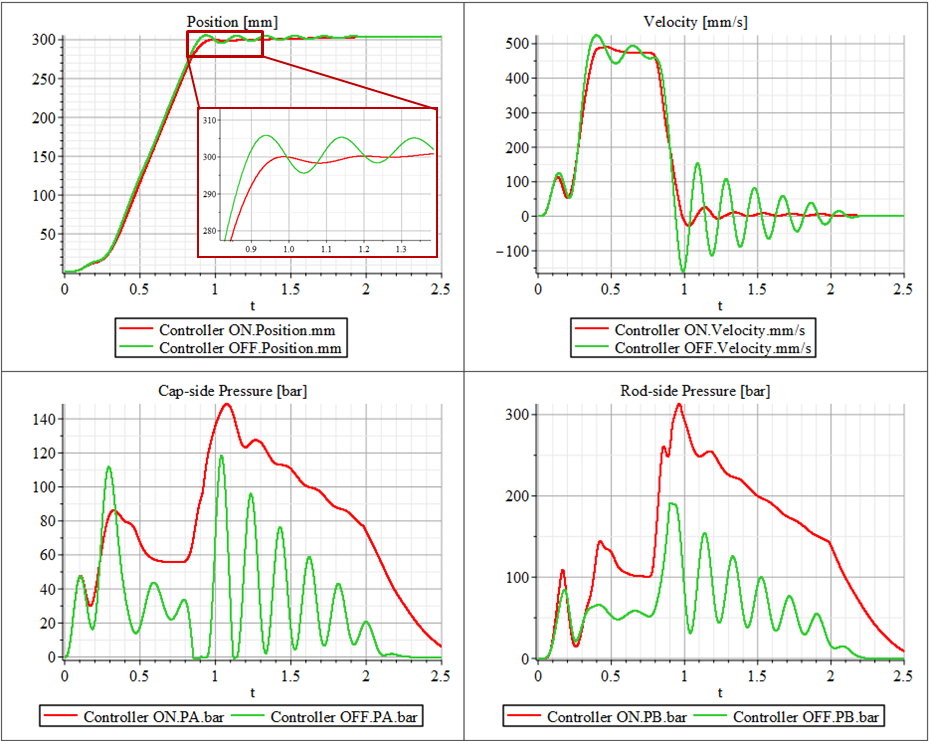Figura 5: Al optimizar el código de control de la máquina, los ingenieros notaron una reducción significativa en las oscilaciones al comparar el sistema hidráulico sin un controlador optimizado (verde) y con la nueva estrategia de control (rojo).
