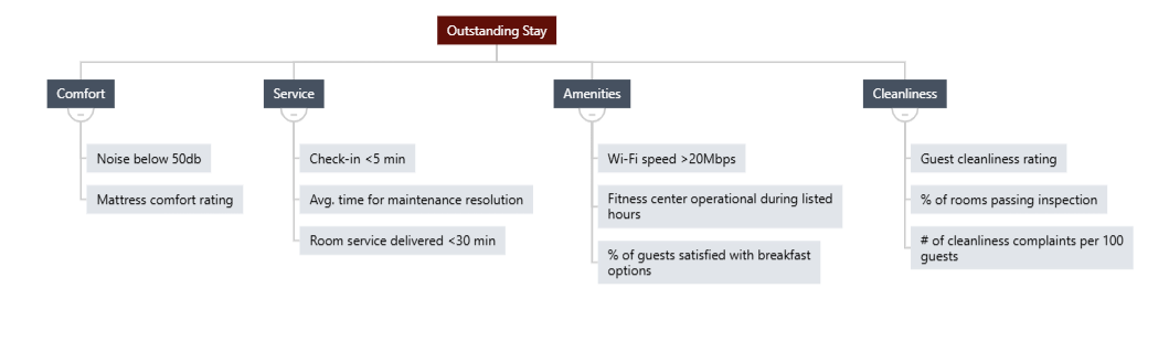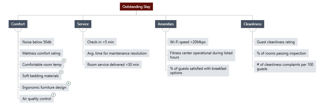Utilizando la herramienta Árbol CTQ de la utilidad <href="https://www.youtube.com/watch?v=4xc2lbwBQTs&ab_channel=Minitab">Lluvia de ideas del Minitab Solution Center, identificaron los factores clave para una excelente experiencia hotelera. La necesidad principal era obvia : «Estancia excepcional», pero la siguiente capa requería más reflexión. A medida que generaban ideas, comenzaron a clasificar las necesidades de los huéspedes en cuatro categorías principales: comodidad, limpieza, rapidez del servicio y servicios.