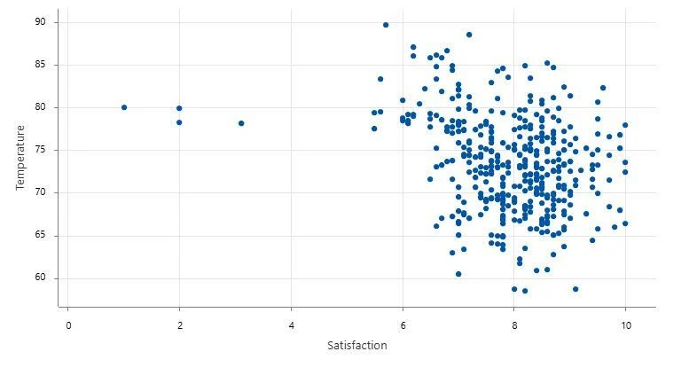El equipo importó seis meses de datos operativos y de encuestas a Minitab Statistical Software, un software de confianza para equipos del sector hotelero que buscan convertir la opinión de los huéspedes en información práctica. Con Graph Builder, crearon un diagrama de dispersión que compara la temperatura ambiente y la satisfacción de los huéspedes.