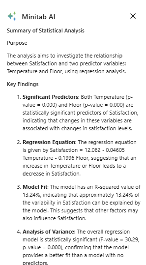 La IA integrada de Minitab generó un resumen en lenguaje sencillo de los hallazgos. Demostró: