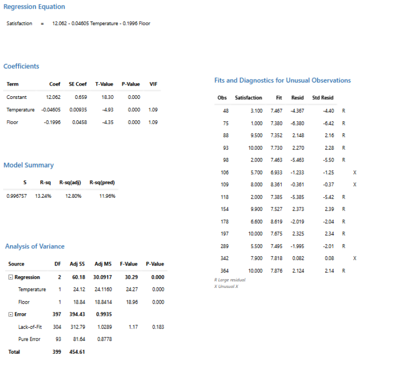 Para cuantificar el impacto, el equipo realizó un análisis de regresión lineal múltiple en Minitab, utilizando la temperatura y el piso como predictores de la satisfacción: