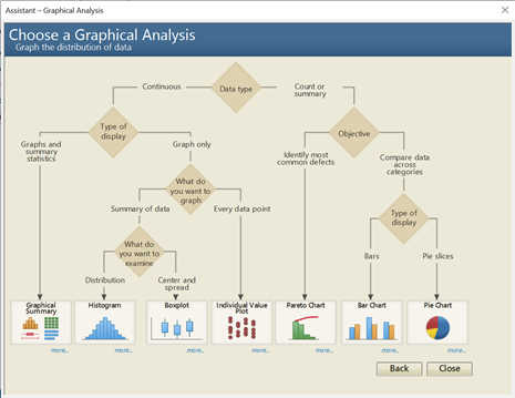Nuestros estadísticos y programadores de Minitab comprenden las necesidades de los analistas y crean herramientas intuitivas de fácil acceso para cualquier tipo de datos. El Asistente > Análisis Gráfico de Minitab permite a los usuarios seleccionar las herramientas adecuadas para su análisis.