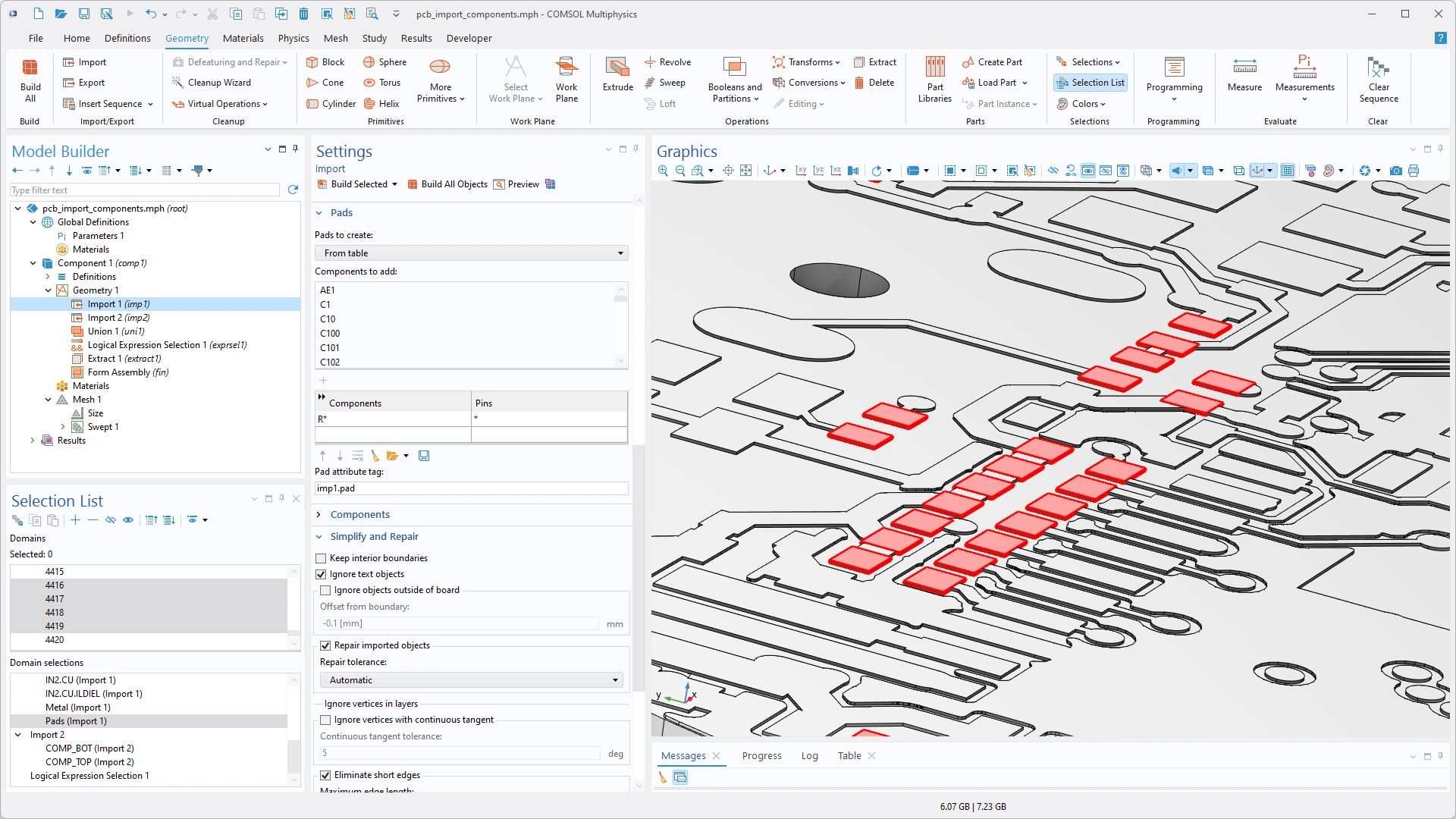 Al importar archivos IPC-2581 y ODB++ a COMSOL Multiphysics® versión 6.3, se pueden generar geometrías de componentes simplificadas en función de los contornos de los componentes en los archivos. Los componentes se pueden representar como caras planas o extruirse utilizando la información de altura del archivo. A estos componentes generados se les asignan atributos automáticamente para una fácil identificación en función de sus nombres y tipos de paquetes. Con las nuevas funciones de selección Logical Expression Selection, los atributos se pueden utilizar en expresiones para crear selecciones.