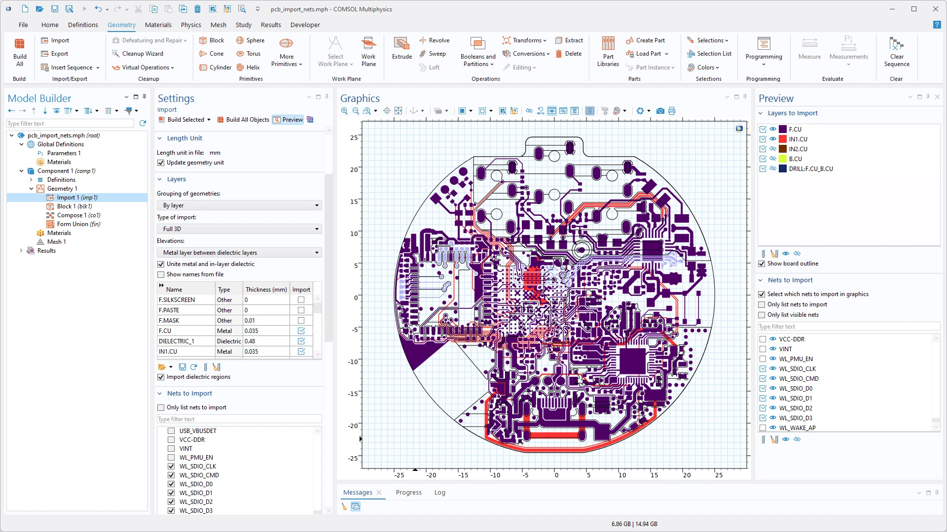 Las capas de un archivo de PCB se pueden visualizar antes de importarlo con el nuevo botón Preview. En la ventana Preview, ahora también es más fácil reducir la geometría generada a unas pocas trazas seleccionadas, seleccionando las capas y redes que se leerán del archivo. La nueva serie de tutoriales Importing PCBs Tutorial Series muestra el uso de esta función.