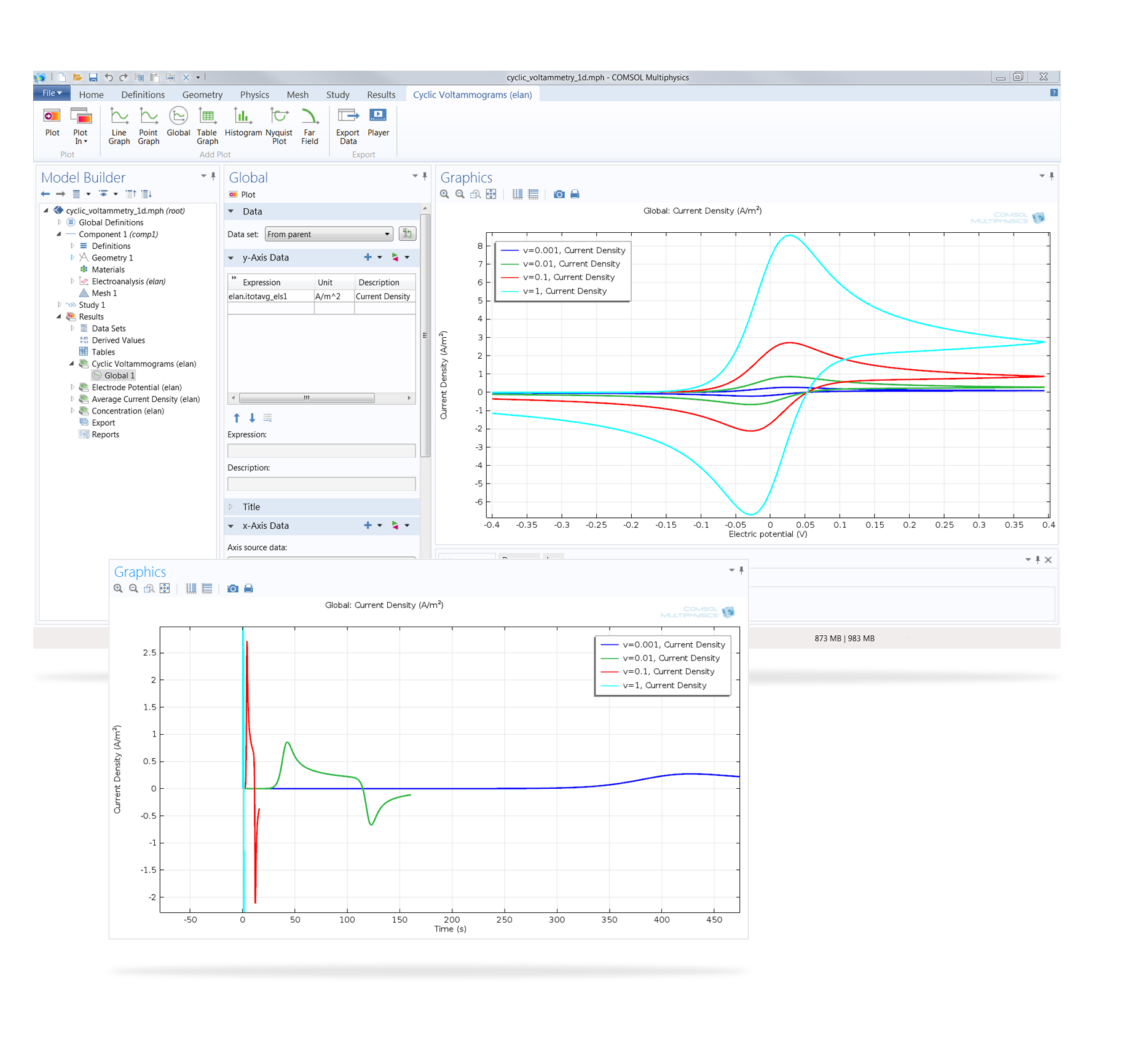 Las interfaces dedicadas en el Electrochemistry Module permiten la definición de voltametría, amperometría, potenciometría, impedancia electroquímica y estudios de coulometría. Las densidades de corriente de intercambio y los sobrepotenciales de activación pueden ser entonces determinados a partir de los resultados combinados de experimentos y simulación.