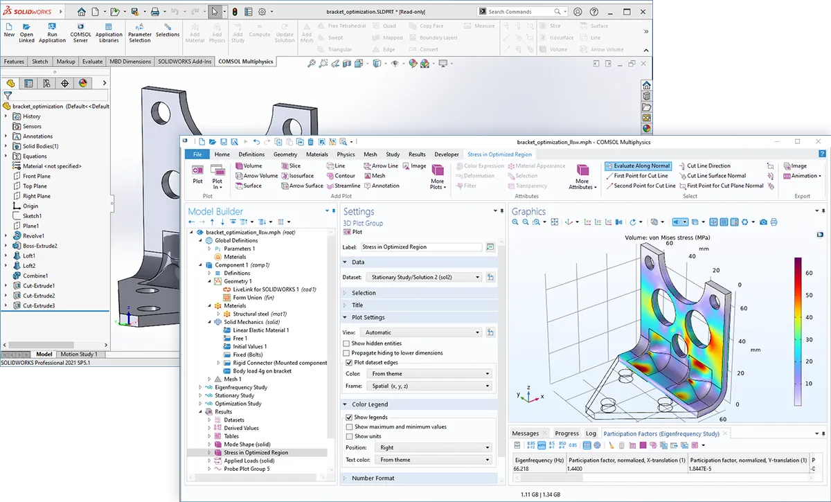 La interfaz de usuario de SOLIDWORKS® que muestra la geometría original y la interfaz de usuario de COMSOL Multiphysics® que muestra el soporte optimizado.