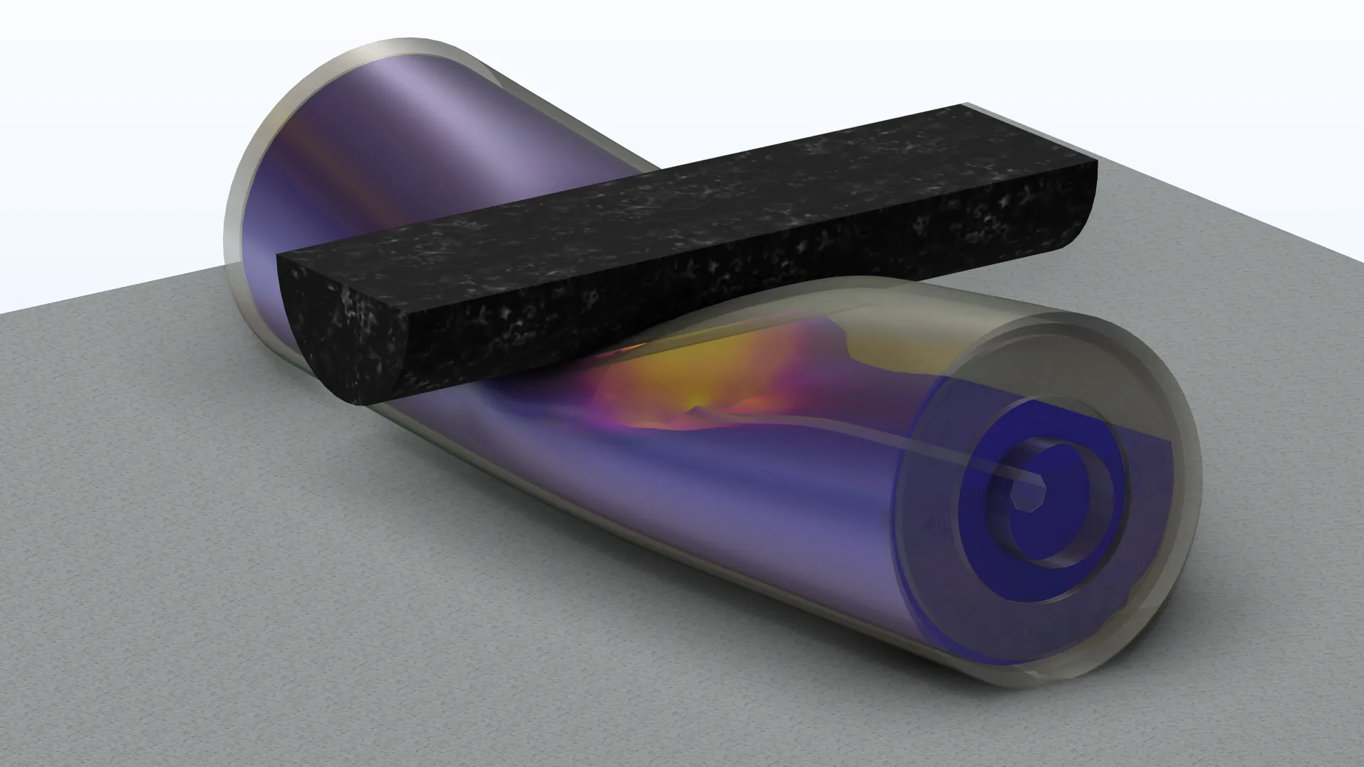 El ejemplo Transient Rolling Contact muestra el concepto de cómo manejar un problema de contacto transitorio con transición de oscilaciones de relajación. Un tubo vacío blando que está sujeto a la carga de la gravedad se suelta en la parte superior de media tubería. Su movimiento varía entre deslizarse y rodar, dependiendo de su posición en la media tubería y su velocidad. La sección transversal de la tubería cambia su forma oval debido al contacto y las fuerzas inerciales. Un balance de energía valida la precisión de la solución.