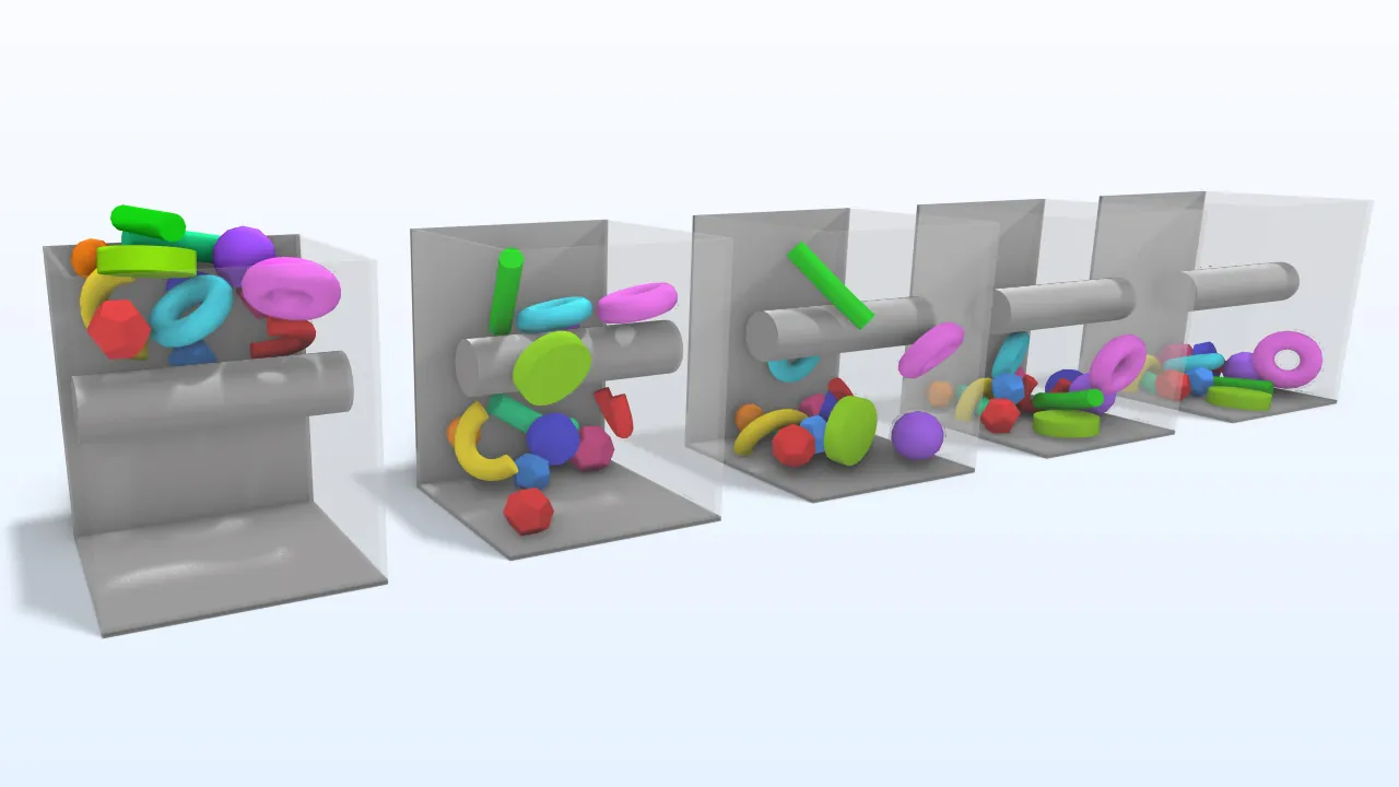 Para facilitar la creación de modelos con un gran número de posibles interacciones de contacto, se ha introducido un nuevo tipo de modelado de contacto que establece automáticamente las condiciones de contacto entre muchos objetos de forma arbitraria. El modelo de tutorial Objects Falling in a Box muestra esta nueva funcionalidad y la mejora significativa del flujo de trabajo.