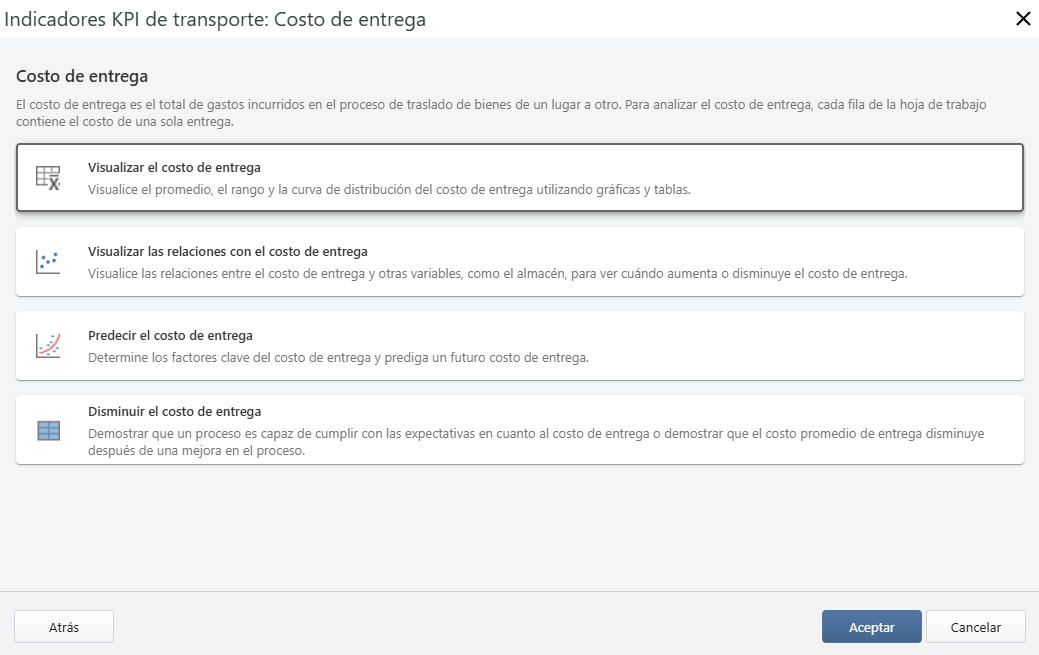 Terminología conocidaCreado para profesionales del transporte, el Módulo de transporte de Minitab ofrece análisis de datos guiado utilizando el lenguaje específico del sector industrial. Concéntrese en indicadores clave del rendimiento (KPI) como eficiencia operativa, uso de activos, tiempos de tránsito, seguridad, impacto ambiental, rendimiento financiero y servicio al cliente, sin tener que preocuparse por cuál análisis elegir. |