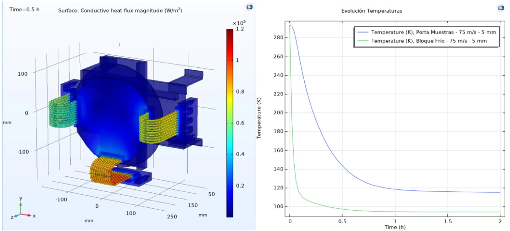 Álvaro Vizcaíno de Julián Los simuladores de atmósfera espacial se utilizan para replicar en un entorno de laboratorio distintas condiciones espaciales, tales como la temperatura, presión o radiación. El objetivo de estos dispositivos es someter una muestra a condiciones espaciales y estudiar sus efectos. En el presente trabajo se estudia la viabilidad de refrigerar con gas nitrógeno, teniendo en cuenta que todos los elementos del sistema de refrigeración conectados al portamuestras deben ser flexibles. El trabajo describe la secuencia del estudio realizado con COMSOL Multiphysics hasta alcanzar la solución final. |