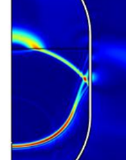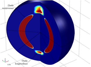 Imagen, cortesía de COMSOL, realizada usando COMSOL Multiphysics®La propagación de ondas acústicas en el seno de los sólidos presenta propiedades sustancialmente distintas respecto a la propagación acústica en los líquidos, siendo la aparición de ondas transversales no evanescentes una de sus principales características. El conocimiento de esta fenomenología abre un amplio abanico de aplicación de las técnicas de inspección ultrasónicas para la caracterización no destructiva de materiales. Algunos ejemplos son la identificación de defectos en soldaduras, la evaluación de procesos de formación y unión de distintos materiales, la prospección geotécnica tanto terrestre como marítima, etc.