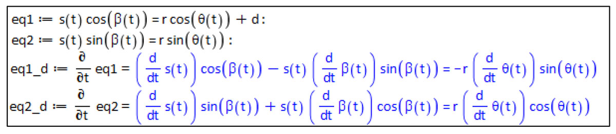 - Las ecuaciones geométricas se pueden reorganizar y manipular simbólicamente. Aquí, diferenciamos las restricciones geométricas de un dispositivo de retorno rápido para obtener las ecuaciones de velocidad lineal y angular.