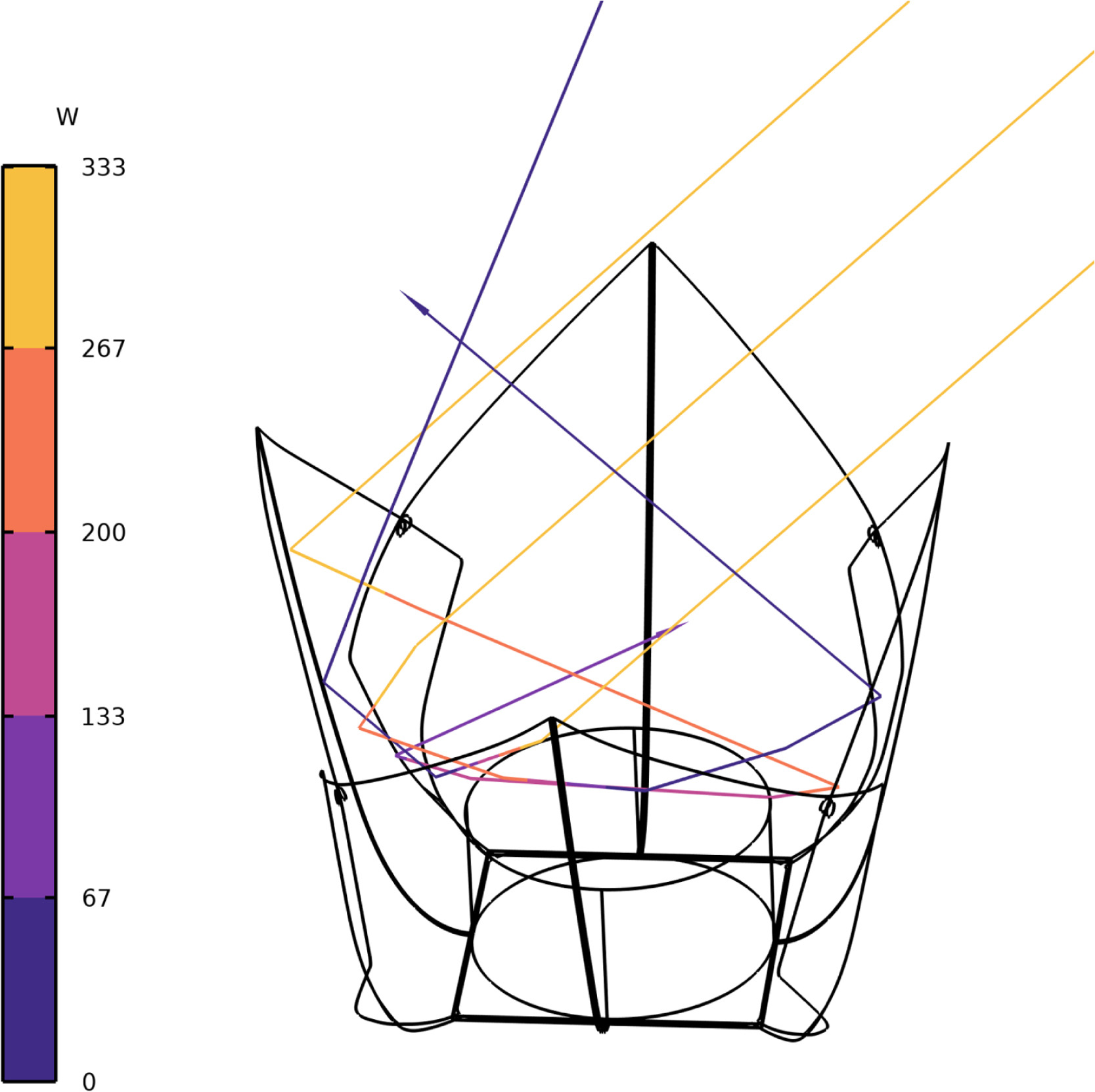 Figura 2. Trazado de rayos en una cocina solar Copenhagen-Flower. Solo se muestra una muestra de 3 rayos.