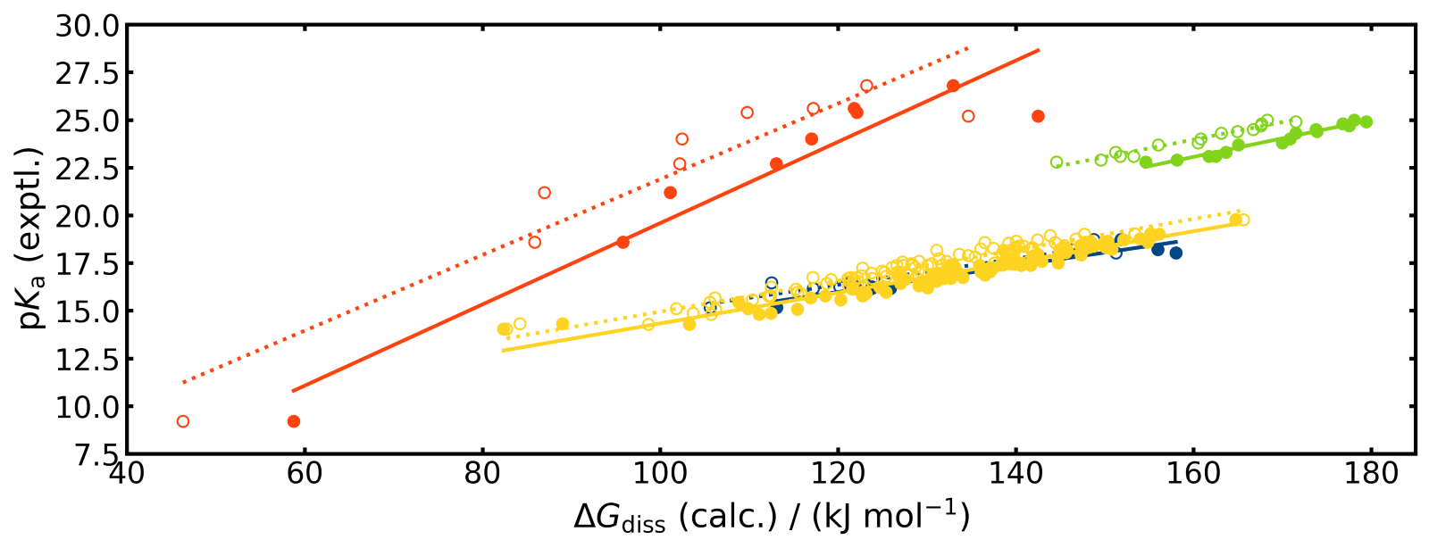 La teoría del funcional de la densidad (DFT) es un método ampliamente utilizado y computacionalmente eficiente para predecir propiedades moleculares. La DFT se ha utilizado con éxito para predecir la ΔGdiss de una variedad de moléculas. La precisión de las predicciones de ΔGdiss utilizando métodos químicos cuánticos puede mejorarse mediante el uso de teoría de alto nivel, como MP2 o CCSD(T). Sin embargo, estos métodos son más costosos desde el punto de vista computacional, lo que puede limitar su aplicación práctica a moléculas pequeñas. En general, la DFT es una buena opción para predecir la ΔGdiss para la mayoría de los ácidos y basesorgánicos.
