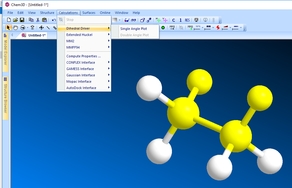 En el caso de realizar este tipo de análisis utilizando Chem3D, podemos simular optimizaciones energéticas para verificar cuál estructura presenta menor energía. Para ello abriremos el archivo de la molécula de etano en Chem3D y seleccionaremos los átomos que aparecen en la siguiente imagen para, a continuación, seleccionar Calculation > dihedral driver > single angle plot.