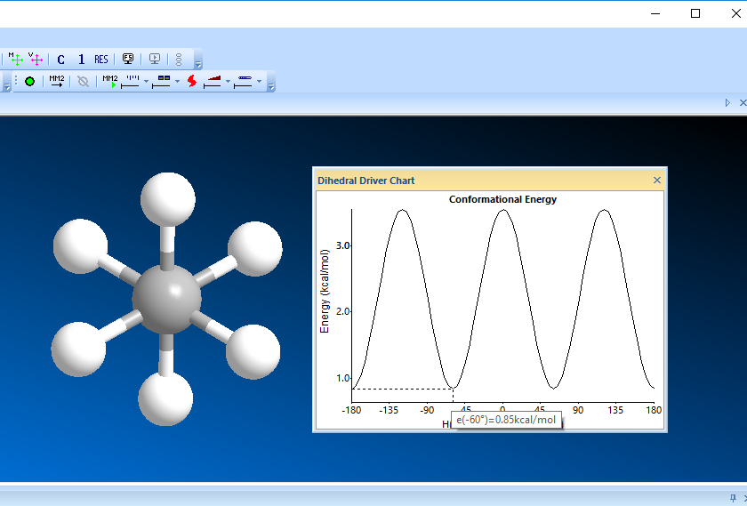Aparecerá en la pantalla principal una gráfica donde aparece representada la energía respecto al ángulo diedro, donde podremos visualizar para qué ángulo la energía de la estructura será mínima siendo, en este caso, -60 y 60º.