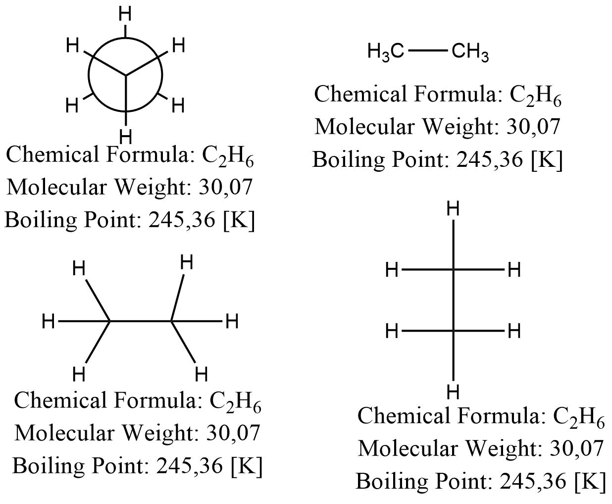 Si analizamos los resultados de propiedades obtenidos mediante ChemDraw para las estructuras siguientes, puede apreciarse que para la interfaz todas y cada una de las estructuras son químicamente idénticas, pues sus puntos de ebullición y peso molecular son iguales. Lo mismo se aplicaría a cada una de las proyecciones de Newman que pudiéramos dibujar.
