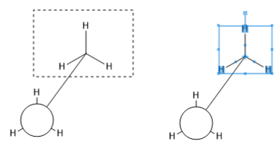 Seguidamente, podemos duplicar este fragmento de metano para generar la estructura del etano. Para ello deberemos seleccionar la molécula de metano previamente dibujada mediante la herramienta “selección” y arrastrar la figura para crear otra idéntica. A continuación, podemos unir los átomos de carbono centrales de cada metano para formar la molécula de etano.