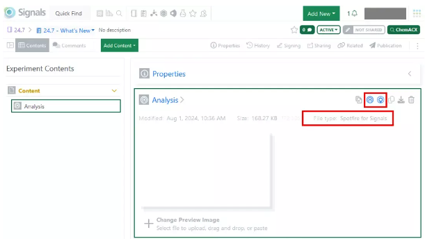 El nuevo Spotfire for Signals está disponible para los usuarios con licencia de Signals Research Suite para uso exclusivo con el Spotfire incluido en Signals Research Suite. Spotfire for Signals es el nuevo valor predeterminado y está disponible en el menú Agregar contenido (crea un archivo de análisis en blanco).