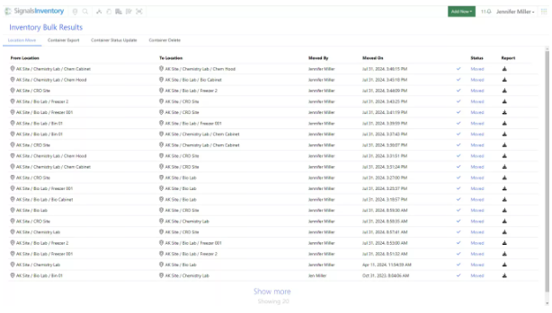 La página Resultados masivos de inventario muestra 20 informes a la vez con la opción Mostrar más.