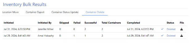 Los contenedores eliminados no se pueden restaurar. Aparecerá una notificación del sistema en la parte inferior de la pantalla, seguida de una notificación debajo de la campana después de que se complete la eliminación. Puede encontrar un informe en los resultados masivos de inventario - Eliminación de contenedores