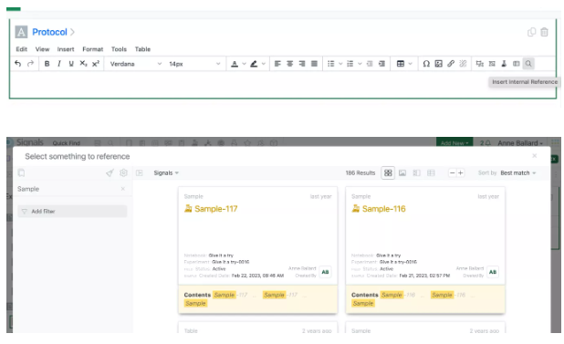 Los usuarios ahora deberían poder insertar una referencia interna en el elemento de texto utilizando dos métodos. En primer lugar, una nueva opción de barra de herramientas de elementos de texto permite a los usuarios buscar e insertar una referencia interna haciendo clic en el icono de la lupa.