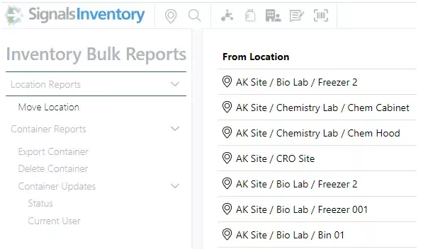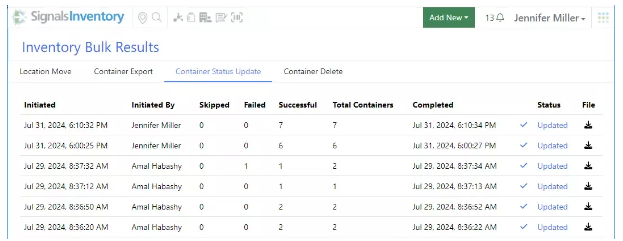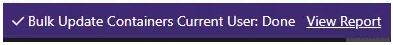 Aparecerá una notificación del sistema en la parte inferior de la pantalla. Se generará un informe y se puede encontrar una notificación debajo del icono de campana. El informe se puede encontrar en Resultados de inventario masivo - Actualización del estado del contenedor: