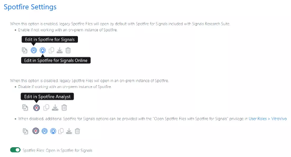 Una nueva configuración de Spotfire permite el uso de Spotfire híbrido, tanto OnPrem Spotfire como Spotfire para señales, dentro de los elementos de información del archivo Spotfire. Estos ajustes no afectan al nuevo elemento de información predeterminado de Spotfire for Signals que es de uso exclusivo con el Spotfire incluido en Signals Research Suite.