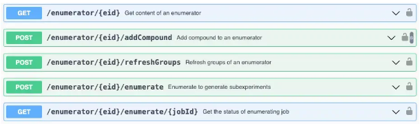 - Adición de un compuesto a un enumerador. Los compuestos individuales se pueden agregar a través de: cdxml, mol, smiles o InChI. Se pueden agregar múltiples compuestos a través de un archivo SDF. Los campos de columna se asignan por la coincidencia exacta del nombre, utilizando el tipo de contenido adecuado (consulte la página Swagger para obtener más detalles)