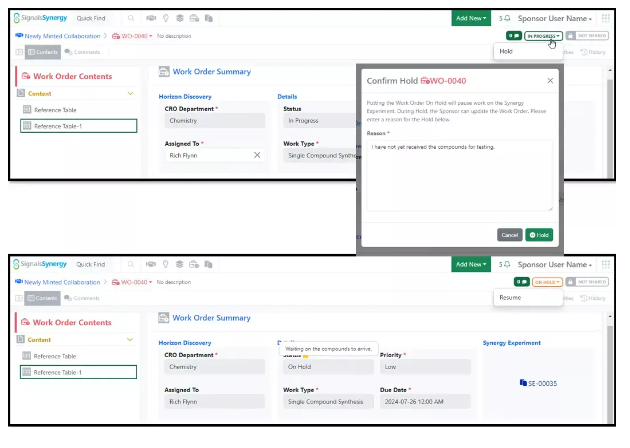 En Synergy, tanto el usuario patrocinador como el usuario CRO pueden poner una orden de trabajo en espera. Al colocar la orden de trabajo en espera, el usuario puede ingresar un motivo. Mientras está en espera, el Patrocinador puede editar la Orden de Trabajo según sea necesario para proporcionar información adicional y reanudar cuando (si) el problema se ha resuelto.