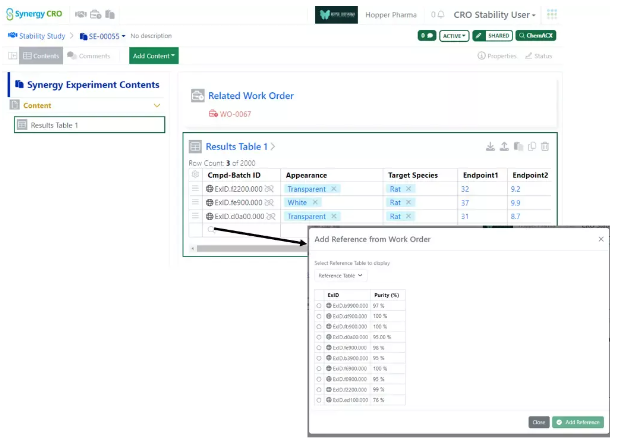 Además, los usuarios de CRO ahora pueden extraer identificadores externos (ExID) para materiales compartidos de la orden de trabajo asociada en campos de referencia internos en tablas definidas por el administrador (ADT). Esto evita el proceso propenso a errores de copiar y pegar identificadores en tablas para capturar resultados. Los usuarios de CRO pueden informar de los resultados relacionados con el ExID, mientras que el Patrocinador puede ver y utilizar tanto el ExID como los ID de materiales internos.