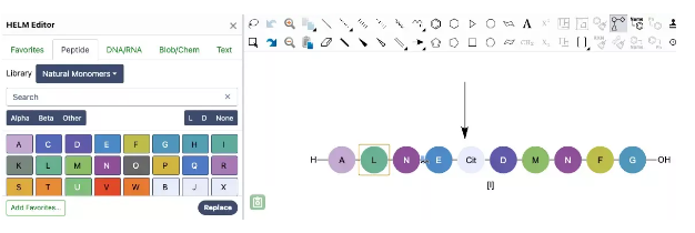 Las mejoras de usabilidad están disponibles para trabajar con estructuras de biopolímeros. Al editar una estructura HELM, una selección de clic de un monómero lo seleccionará para su reemplazo. Del mismo modo, una selección de clic del enlace seleccionará si como punto de inserción para que se agregue un nuevo monómero. Los botones en la parte inferior del Editor de HELM se han eliminado y reemplazado con una insignia que indica el modo 'Insertar' o 'Reemplazar'. Además, ahora es posible recorrer una estructura HELM mediante la navegación de flechas con el teclado. Una vez que se selecciona un monómero o enlace, se pueden usar las flechas direccionales en el teclado para alternar entre la selección de monómero y enlace a lo largo de la totalidad de la secuencia.